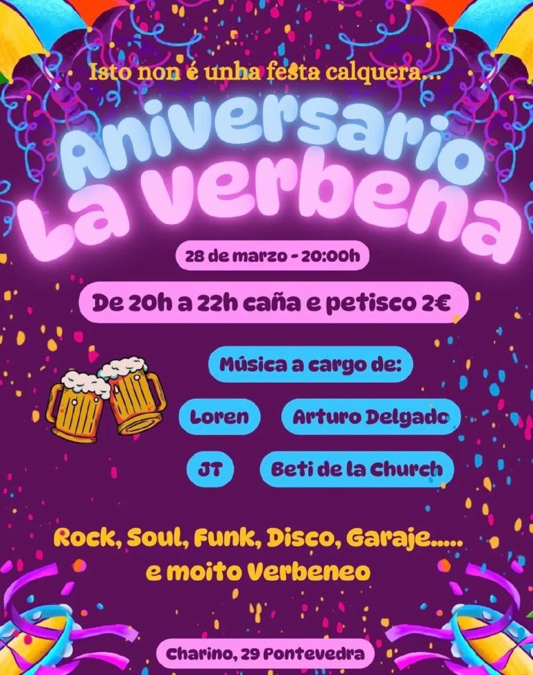 O Aniversario de La Verbena celebrarase o 28 de marzo a partir das 20:00 horas no Charino, 29, en Pontevedra. […] ...