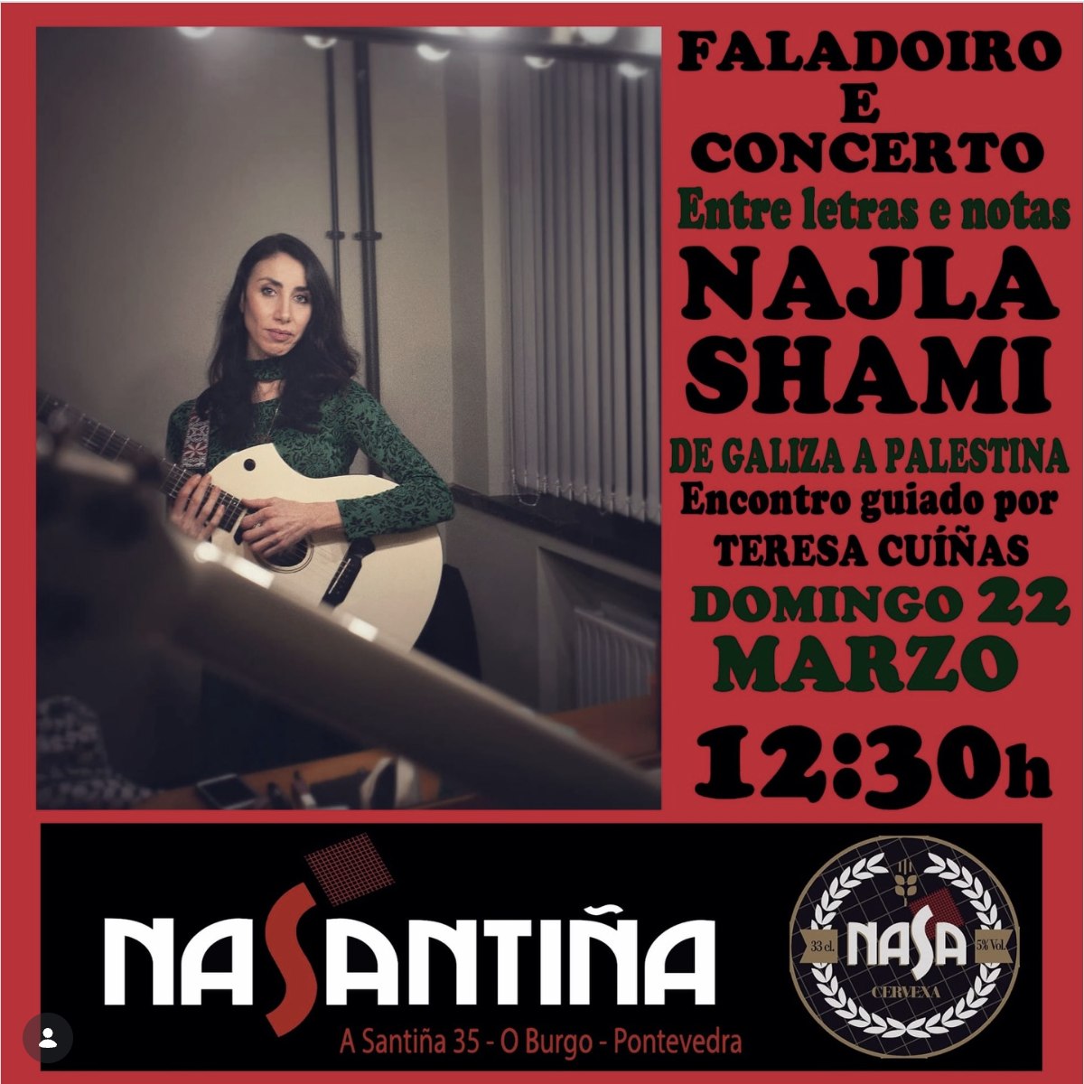 Este domingo, el espacio cultural NaSantiña acogerá un evento que combina un faladoiro y un concierto protagonizado por la artista galego-palestina Najla Shami. La periodista Teresa Cuíñas será la encargada de moderar esta charla en una nueva edición del ciclo ‘Entre Letras e Notas’.