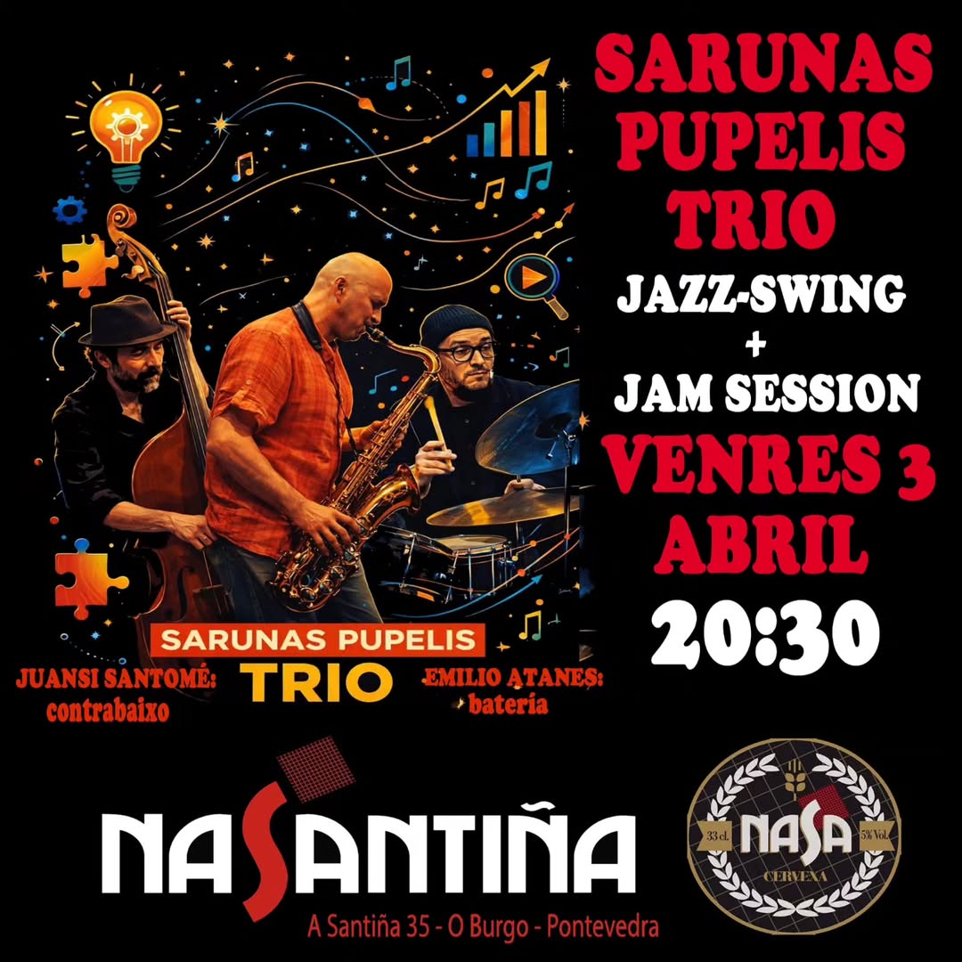 El Sarunas Pupelis Trio, compuesto por el saxofonista lituano Sarunas Pupelis, el contrabajista Juansy Santomé y el batería Emilio Atanes, ofrecerá una actuación en la que fusionan el jazz y el swing. Este evento tendrá lugar en NaSantiña, un espacio reconocido por su ambiente acogedor y su apoyo a la música en vivo.