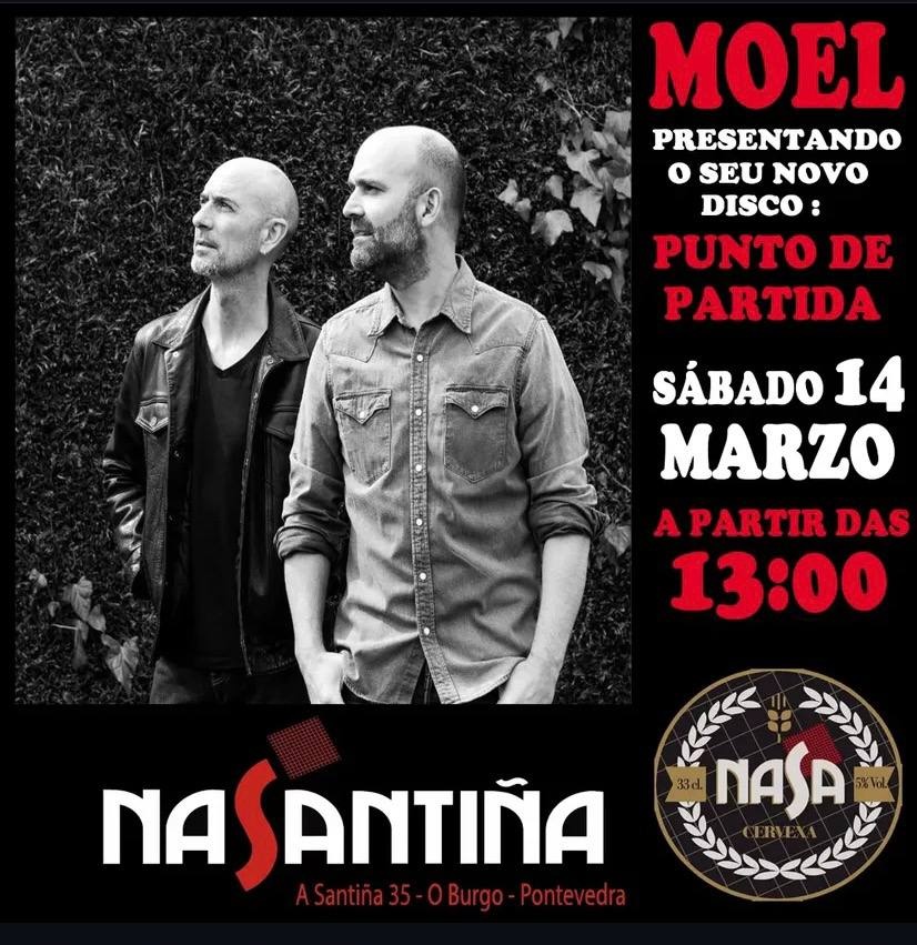 O próximo sábado, o dúo MOEL, composto por Carlos Abal e Ramón Núñez, ofrecerá un concerto en Na Santiña, situado en O Burgo, Pontevedra, para presentar o seu álbum debut titulado Punto de Partida. Este traballo discográfico inclúe unha selección de cancións que se caracterizan pola súa atmósfera íntima e reflexiva, cunha clara predominancia de medios tempos e baladas.